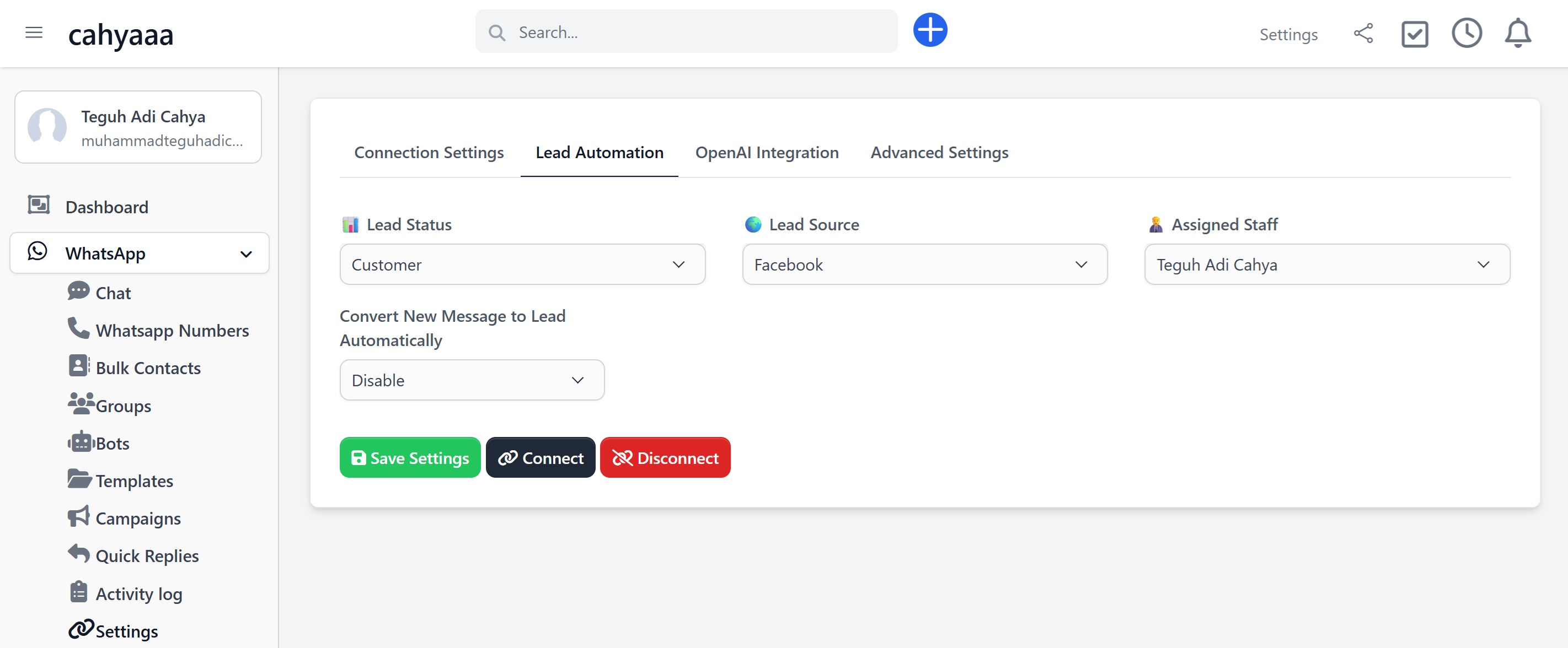 The Lead Automation Settings allow you to automatically convert WhatsApp chats into Leads within Clorofile Cloud. You can define the default lead status, source, and staff assignment for each new inquiry that originates from WhatsApp conversations.