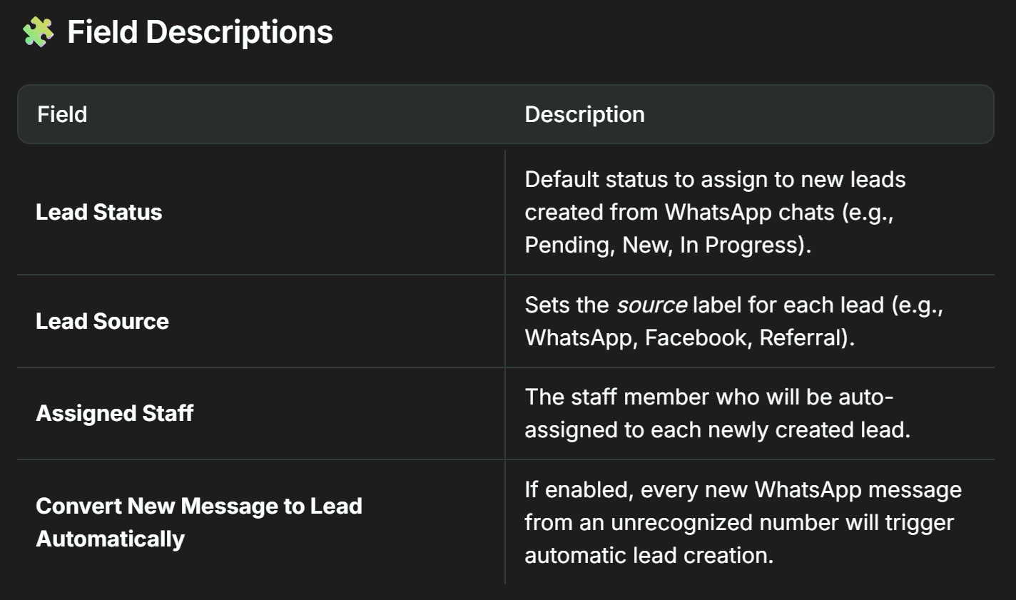 whatsappto filter these leads in your reports. - Enable automatic conversion only if your team can manage lead flow effectively.