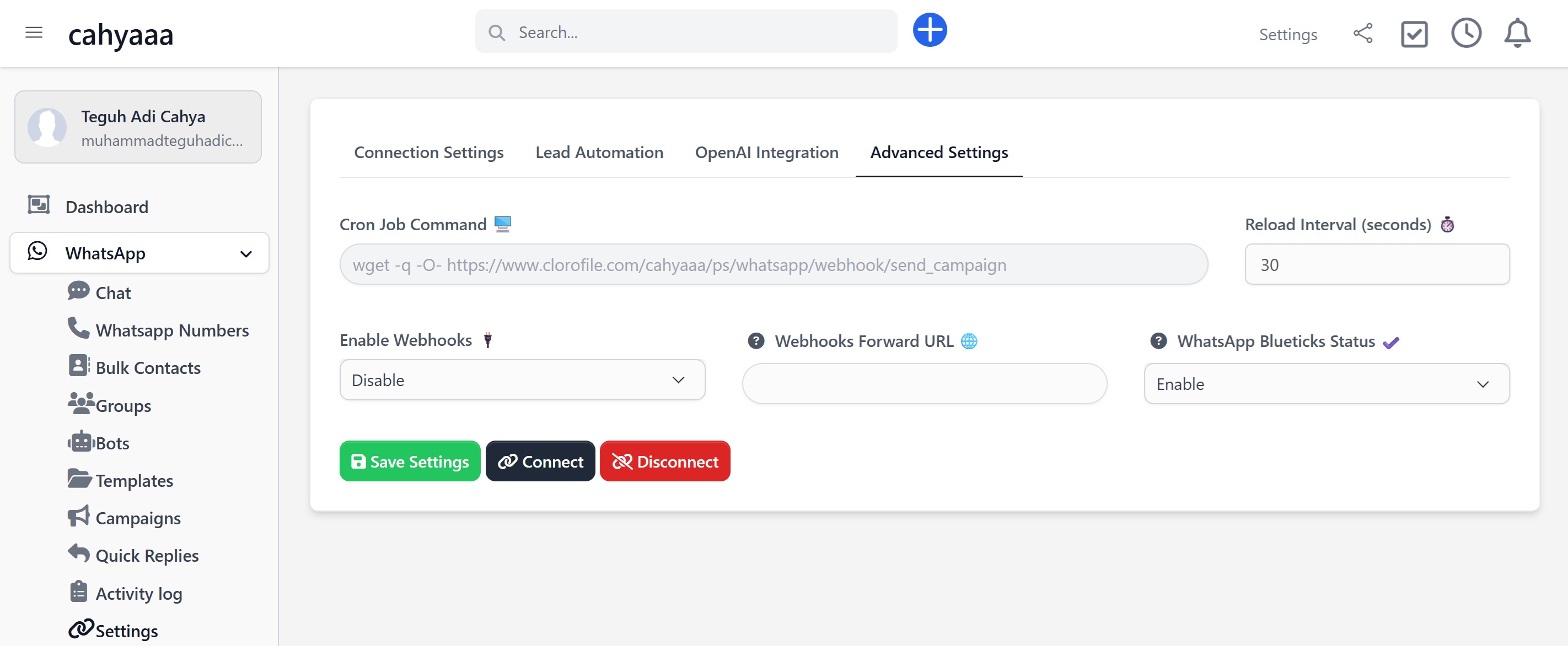 This section lets you connect your OpenAI API Token and control how AI responds to WhatsApp chats inside Clorofile Cloud. You can configure the AI to assist manually or respond automatically depending on your workflow.